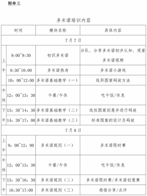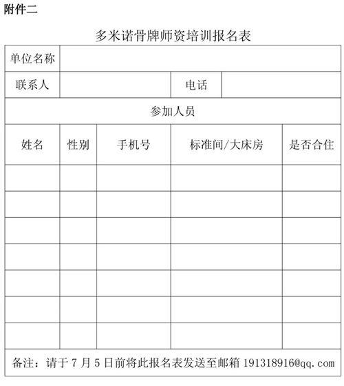 请有意向的院校,选派教师参加,于7月5日前填写《多米诺骨牌师资培训报名表》(见附件二),并发送至邮箱191318916@qq.com。