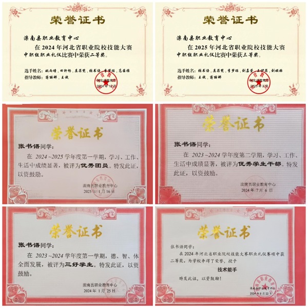 张书语的成长履历中,“技能大赛”是浓墨重彩的一笔。2024年7月,她首次代表学校出征唐山市职业院校技能大赛“职业礼仪”赛项,与团队成员默契配合,斩获团体二等奖;同年12月,她站上更高舞台,在河北省职业院校技能大赛中再夺“职业礼仪”团体二等奖;2025年2月,她第二次征战省级赛事,获团体三等奖。