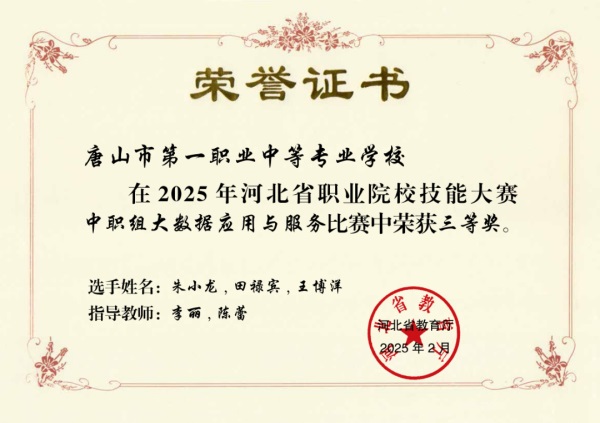 2025年我校学子征战河北省技能大赛“大数据应用于服务”赛项。经严格选拔与专业指导,选手以过硬实力荣获省级三等奖,彰显专业风采。