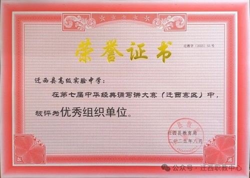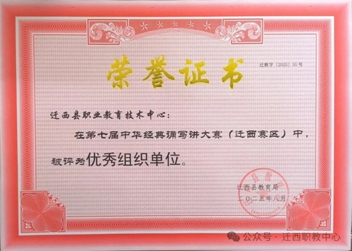 迁西县职业技术教育中心(迁西县高级实验中学)在第七届中华经典诵写讲大赛(迁西赛区)中脱颖而出,凭借卓越的组织工作与积极投入,荣获“优秀组织单位”称号!