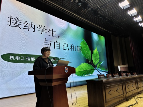 机电工程部的李丹丹老师以《接纳学生,与自己和解》为主题,分享了其从教多年来的心路历程与成长蜕变。她通过“一米九大男孩在脸盆里放花生皮”和“假期不断兼职的贫困家庭学生”等生动案例,娓娓道来自己如何从最初的困惑、生气,逐渐走向理解与接纳。她深刻地认识到,教育需要接纳学生及其家庭的实际情况,并在此基础上与自己作为教师的“气”和解,做到“遵规守纪,端正个人行为”,在合规合法的前提下做好育人工作。她的分享充满了教育的温度与教师自我成长的哲思。