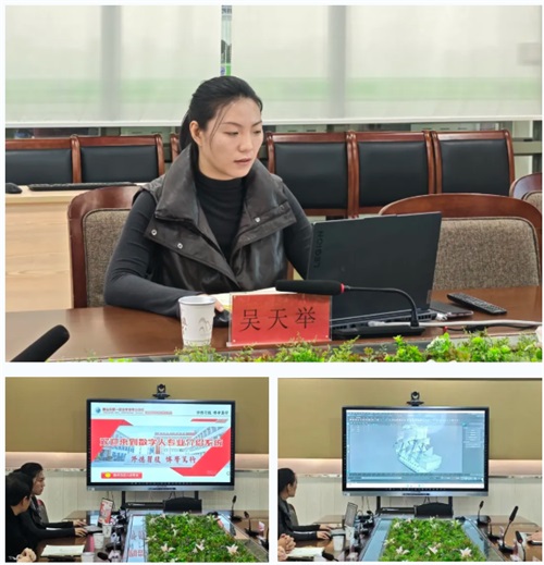 我校数字媒体专业教研组组长吴天举详细介绍了近年师生在省、市级技能大赛获奖情况及育人成果,对数字人模型、学生参赛作品等进行操作演示。