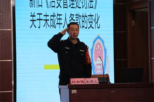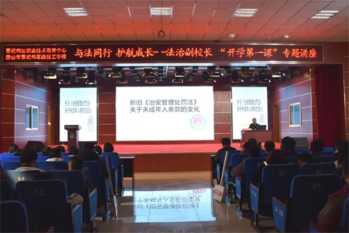 为增强学生法治观念,预防和减少未成年人违法犯罪,营造平安和谐的校园环境,3月11日下午,曹妃甸区职教中心(高级技校)特邀唐海镇派出所警官、学校法治副校长刘士俊走进校园,开展以“新旧《治安管理处罚法》关于未成年人条款的变化”为主题的法治“开学第一课”专题讲座。全校近千名师生到场聆听。