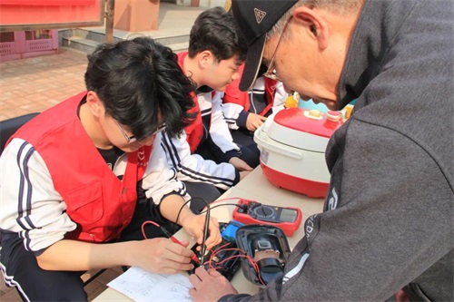 活动现场暖意融融。党员教师充分发挥专业优势与先锋模范作用,凭借扎实的实训教学功底与实操经验,为社区居民逐一排查小家电故障。从洗地机、电水壶的电路检修,到电饭煲、电磁炉的零件更换,党员老师们认真检查故障、仔细维修、耐心解答居民的疑问,手把手向学生传授维修技巧与安全规范。学生志愿者们以严谨的态度跟随学习,主动承担配件整理、工具递送等辅助工作,在实践中深化技能应用,展现出青年学子勤学善练、笃行实干的良好风貌。此次共修理小家电10余件,社区居民纷纷表示,感谢学校师生的帮助,解决了他们的实际难题。