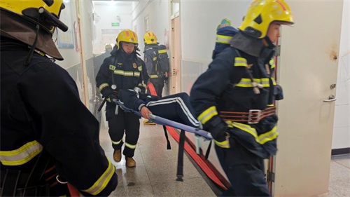 学生撤离完毕后,消防救援队伍随即展开专业救援行动。四名消防队员迅速铺设消防水带,精准对准起火点位实施灭火作业,有效控制了火势蔓延;搜救组深入宿舍楼道进行搜寻,将一名模拟被困学生用担架平稳抬出,并在现场完成救治与固定。整个救援流程分工明确、配合默契,从火情警戒、扑火攻坚到伤员转运,各环节衔接有序。这不仅展现了消防员过硬的专业技能,更让师生直观学习到火灾救援的规范流程。
