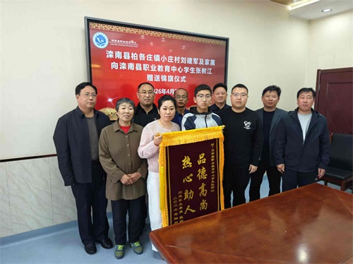 4月21日下午,滦南县柏各庄镇小庄村村民刘建军在家人陪同下,专程来到滦南职教中心,将一面写有“品德高尚 热心助人”的锦旗郑重交到25电气1班学生张树江手中,感谢他危急时刻挺身而出、全力救助。县委第二巡察组组长崔贺新,校党委书记杨会军,副书记、校长晁树山,副校长张玉林及相关科室领导参加了赠旗仪式。