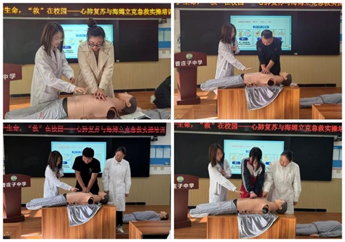 实操体验环节气氛热烈,职教中心护理专业学生现场进行标准示范,精准的操作展现了专业素养,赢得了阵阵掌声;曹庄子中学师生踊跃参与,从判断意识到人工呼吸施救,每一步都认真细致。分组练习环节,培训团队成员手把手进行指导,及时纠正不规范动作,确保了每位参训者都能学懂弄通并熟练掌握施救要领,参训师生纷纷表示,此次培训干货满满,通过实操彻底掌握了急救技能,为校园安全工作增添了一项基础保障。