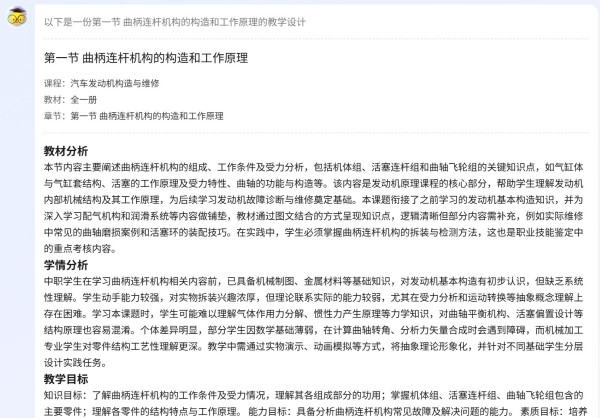 在湖北恩施的建始县中等职业技术学校,一节汽修专业课的备课正在颠覆传统教学模式,教师轻点屏幕,AI小博士一键生成与汽车维修实际操作流程紧密相关的教案;在教学支持方面,能为中职语文、英语课程生成符合职业场景的范文……这所国家级重点职校的变革,正是AI赋能职业教育的缩影。
