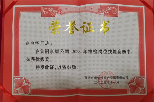 2023年首钢京唐公司维检技能大赛优秀奖;