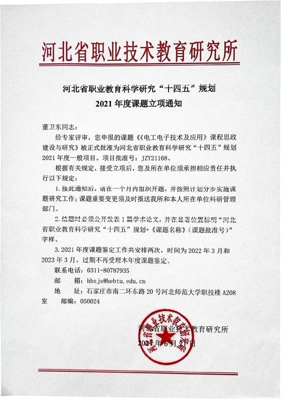 河北省职业技术教育研究所2021年3月发布了关于“十四五”规划2021年度课题的通知,根据文件中课题研究申报办法、课题研究指南要求和学校教育教学研究实际需求,丰南职教中心于2021年4月份组织开展了此次课题申报工作。同时对上报课题认真审核严格把关,并按照要求上报了相关材料。