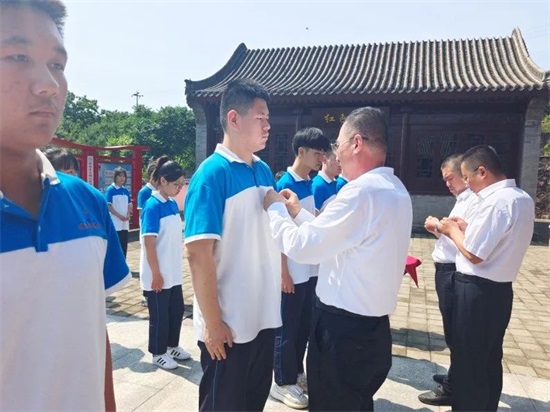 团委书记润桂英带领新团员庄严宣誓,随后校长杨国庆、副校长侯振华、王新刚、李志富为新团员佩戴团徽。