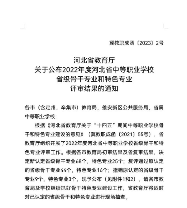 日前,河北省教育厅公布了《2022年度河北省中等职业学校省级骨干专业和特色专业评审结果的通知》(冀教职成函〔2023〕2号),乐亭职校汽车运用与维修专业顺利通过省级复审。这也是乐亭职校2022年度继数控技术应用专业获评市级骨干专业之后,在专业建设方面取得的又一显著成果。