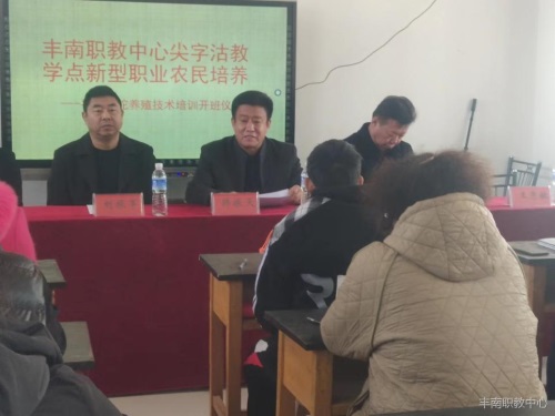 2023年3月24日上午,丰南区职教中心尖字沽教学点在漠尚客平原骆驼养殖教科研基地举行平原骆驼养殖技术培训开班典礼。区职教中心校长韩振天、区教育局成职科科长刘振军、区职教中心主任王大强在主席台就坐,来自丰南区6个乡镇的20名学员参加仪式。