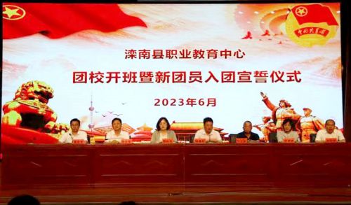 为深入贯彻落实习近平总书记关于加强新时代团员队伍先进性建设的重要指示,进一步落实从严治团要求,完善团员发展程序的规范化,提高团员骨干的思想政治素质及工作能力,6月19日上午,滦南县职业教育中心在修德礼堂举行团校开班暨新团员入团宣誓仪式。出席仪式的领导有:团县委书记邸烁冉,教育局副总督学刘立新,教育局团委书记郑翠艳,校党委书记冯俊新,校党委副书记、校长杨会军,副校长杨建军,副校长张新军。各处室负责人、老团员代表及2023年新团员参加了宣誓仪式。副校长杨建军主持。