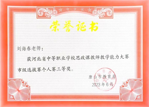 04刘娜等获思政课教学能力大赛团队三等奖,周智慧、刘海春、张银平参赛唐山市思政课教学能力大赛获三等奖并参加河北省中职思政课教师教学能力比赛;