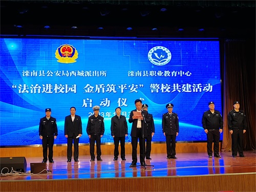 11月3日上午,为认真贯彻落实中共中央、国务院《关于进一步加强和改进未成年人思想道德建设的实施意见》和《未成年人保护法》,提高未成年人思想道德水平和法律素质,进一步加强校园安全管理工作,积极构建警、校联动长效工作机制,滦南县职业教育中心在修德礼堂隆重举行“法治进校园 金盾筑平安”警校共建动员大会。出席大会的领导有:滦南县公安局西城区派出所所长李洪峰、指导员李学志,滦南县公安局交警大队副大队长赵祥禄,县教育局副局长王伟,西城派出所警官赵玺然、刘朗卿、姜润平,滦南县职业教育中心党委副书记、校长杨会军,副校长杨建军。督学裴祥学主持大会。