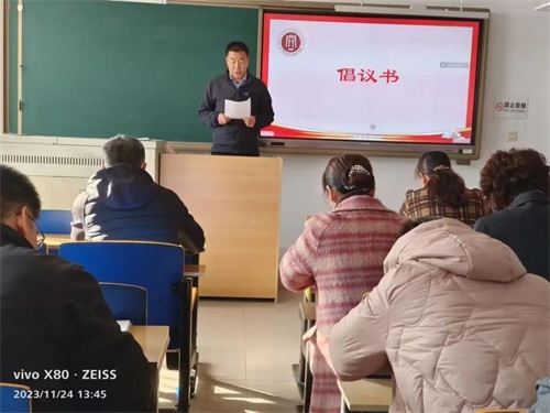 接下来开平职校党支部、校长王印勤同志宣读《倡议书》。德为育才之首,德为师者之道。遵师德规范,慕师德高远,扬师德正气,守师德底线。