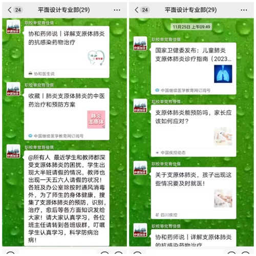 平面专业部不但充分利用晨会、班队会等途径对学生进行卫生知识教育,而且充分利用微信平台宣传阵地进行卫生知识的普及和宣传,向老师、家长、学生发送了《国家卫健委发布:儿童肺炎支原体肺炎诊疗指南》、《支原体肺炎能预防吗,家长应该如何应对》、《关于支原体肺炎,孩子出现这些情况要及时就医》、《讲解支原体肺炎的抗感染药物治疗》、《肺炎支原体肺炎的中医药治疗和预防方案》等相关信息,将卫生教育纳入了师生日常,引导学生养成良好的卫生习惯,自觉增强卫生安全意识。