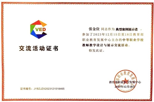 12月17日,2023年全国中等职业学校教师教学设计与展示系列交流活动在广州市财经商贸职业学校落下帷幕,我校青年教师张金位作为河北省推选的代表之一,与来自全国近百名专业教师共同参加交流展示,荣获”典型案例展示者”称号,其作品《火花塞的检查与更换》将通过国家“智慧职教”网络平台进行展示,并由高等教育出版社组织出版案例集向全国推广。