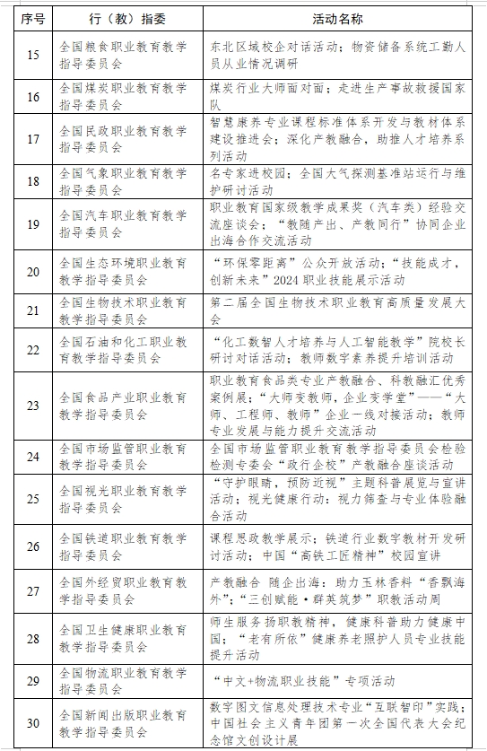 教育部等十部门分别在本系统内牵头组织开展若干项全国性活动(活动清单见附件1)。教育部行业职业教育教学指导委员会工作办公室组织全国行业职业教育教学指导委员会〔以下简称行(教)指委〕结合行业特点,精心设计打造行业领域内全国性活动,深化产教融合校企合作、聚合行业企业资源。各行(教)指委特色活动清单见附件2。