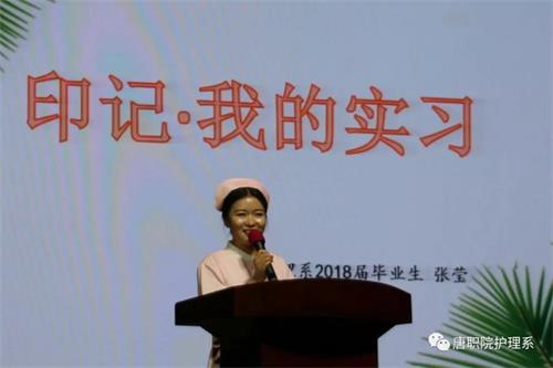 护理系2018届毕业生张莹为师生带来题为《印记·我的实习》的演讲,分享了她在北京301医院的实习心得,并与同学们共勉。她对母校的培养和老师们的教导表达了深情感谢,希望同学们珍惜在校时光,勤奋学习、苦练技术,努力成为一名优秀的护士。