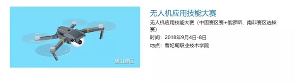 2018一带一路暨金砖国家技能发展与技术创新大赛首届“无人机应用技能”赛项即将燃爆职教城。2018 一带一路暨金砖国家技能发展与技术创新大赛重点围绕 3D 打印、智能制造、模具智能制造、工业机器人、移动机器人、VR 设计、无人机应用技能7个赛项展开,分为中国赛区决赛、南非赛区选拔赛、俄罗斯赛区选拔赛。