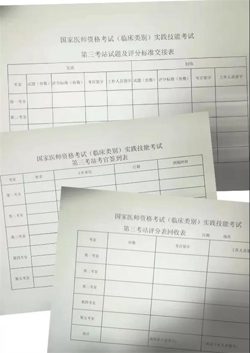 每个考站墙上的文明用语,大家一字一句推敲,参考大量考试场地资料;工作人员指导用语,他们结合情境反复排练,语速、手势、微笑……都要给考生如沐春风之感,务必给考生提供最佳的服务;如何快速有序分发、回收试卷,他们合理安排工作人员,不断优化工作方式;评分表回收表、试题及评分标准交接表、考官签到表,二站、三站需要用到的表格,是姚廷红设计、制作的,她查找了很多资料,并在唐山卫校相关老师的指导下,才完成了这三个表格。在河北省评审时,评审团还给予了一定好评。