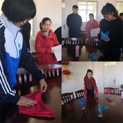 展望未来,要有勇气应对变化,有志气拥抱梦想,更要有实力立于不败之地。为了检验同学们的实力,系里又安排了餐巾折花、斟酒、摆台、铺床等基本技能的比赛展示活动,副校长王庆胜、系主任杨乐、助理毕丽曼和毕冬玲现场观摩,所有专业老师当评委。学生在杨向南和张爱莹两位老师指导下,出色完成了展示任务。