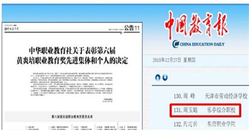 日前,全国黄炎培职业教育奖颁奖大会在北京召开,经过各省初选、专家评分、现场投票、评审表决、网上公示、实地考察等环节,评选出优秀学校奖,杰出校长奖,杰出教师奖等奖项,乐亭综合职校周玉娟老师荣获黄炎培职业教育奖杰出教师奖。