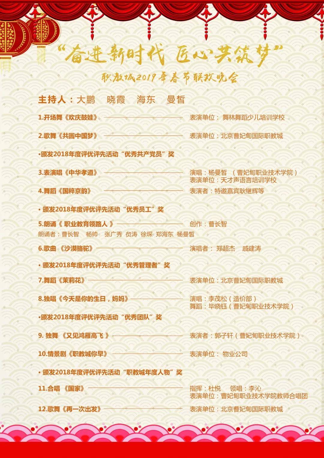 晚会节目以团结欢乐,喜庆祥和,昂扬向上,凝聚正能量,弘扬社会主义核心价值观为主要基调,为公司全体员工送上一场丰盛的文化盛宴。晚会共有歌舞《共圆中国梦》、《中华孝道》、《再一次出发》,舞蹈《欢庆鼓娃》、《国粹京韵》、《茉莉花》、《又见鸿雁高飞》,歌曲《今天是你的生日,妈妈》、《沙漠骆驼》、《国家》,朗诵《职业教育领路人》,情景剧《职教城你早》12个节目,通过生动形象、富有感染力的艺术形式,期望展现职教城人追梦圆梦、不懈奋斗的精神,表达全体员工欢度新春佳节的喜悦之情和对美好未来的无限期盼,精气神十足、正能量强劲。