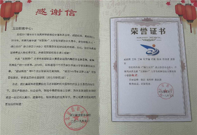 近日,河北政法职业学院给玉田职教中心发来感谢信。信中写到,玉田职教中心2017届毕业生梁景富、王健和张爽三名学生在大学期间成绩优异、表现突出,在第四届中国“互联网+”大学生创新创业大赛中,均获得铜奖,对这校为其输送大批优秀学生表示衷心感谢。