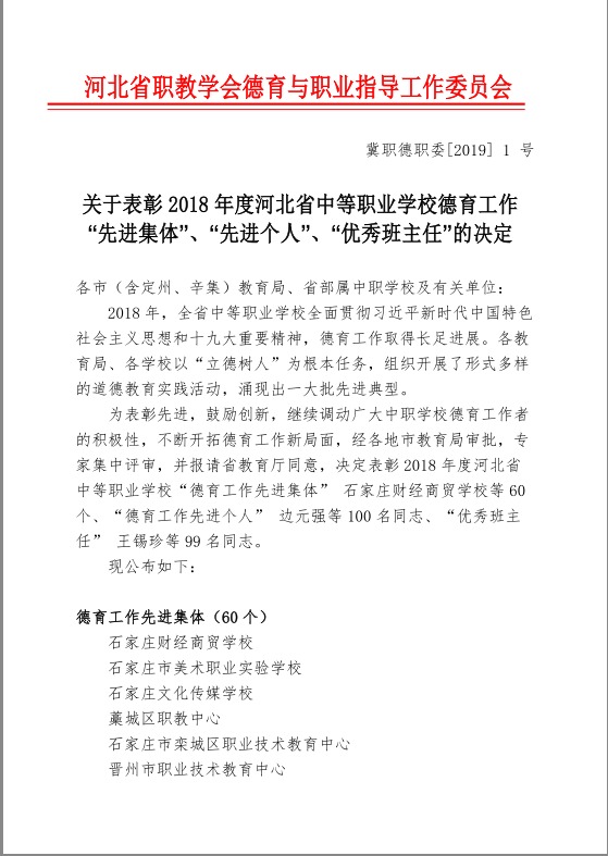 日前,滦南县职业教育中心被河北省职业教育学会评选为“2018年度河北省中等职业学校德育工作先进集体”。