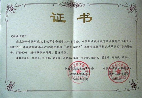周郝全老师主持的《计算机硬件实训产教融合课程的校本项目化教学与实践》课题、史艳亮主持的《职业体验式汽修专业教学模式改革探究》课题,分别顺利通过中国职业技术教育学会教学工作委员会和中国职业技术教育学会教材工作委员会验收并结题
