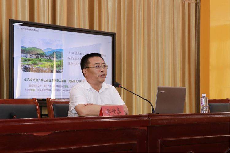 李校长以PPT形式讲解了《习近平新时代中国特色社会主义思想》三十讲中的第二十二讲 《建设美丽中国》。李校长的党课讲解形象生动、深入浅出,从坚持人与自然和谐共生、树立和践行绿水青山就是金山银山的理念、推动形成绿色发展方式和生活生式、统筹山水林田湖系统治理和实行最严格生态环境保护制度等五个方面讲述了生态文明建设的重要意义,并号召全体党员、教师积极行动起来,为推进生态文明建设做出应有的努力和贡献。