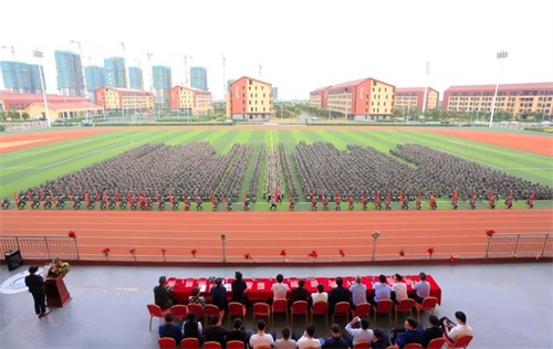9月13日,曹妃甸职业技术学院2019级新生军训结营式暨开学典礼隆重举行。曹妃甸区教育体育局副局长李全武、曹妃甸区公安局国保支队张伟、曹妃甸区高尚堡边防派出所所长杨勇,军训团团长高昌权,北京曹妃甸职教城投资有限公司党委书记薛怀南,副总经理付华、孙正思、杨智淋,曹妃甸职业技术学院校长谭靖,副校长张桂芹等领导出席本次活动。曹妃甸职业技术学院副校长梁建刚主持活动。