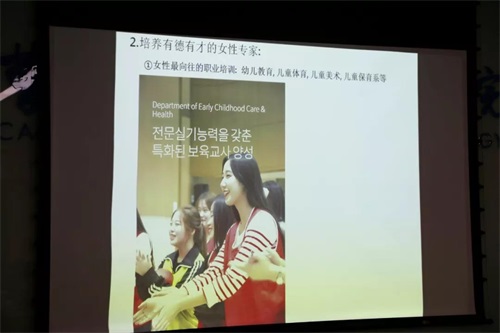座谈会上,双方一同观看了《北京曹妃甸国际职教城宣传片》和《韩国敬仁女子大学宣传片》,金美良主要介绍了韩国敬仁女子大学的地理区位优势、总体规划、发展理念以及当前的教育教学情况和未来发展规划等内容,并就专业课程详细讲述了发展历程及学生就业方向。