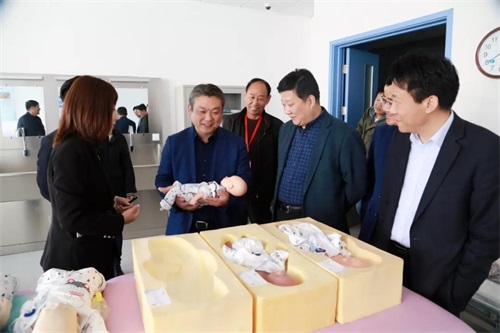 王学峰一行车览了职教城首期建成的三所校区风貌和整体规划布局,在护理与健康学院实训中心薛怀南向嘉宾们详细介绍了职教城“三区、两轴、一带”的整体规划,具体讲解了“职教城起步区”、“京津冀教育承接转移区”和“职教城产城配套区”三个区域规划内容,以及曹妃甸职业技术学院发展情况、办学理念及教育成果。王学峰一行参观了教学区、考站区、外科区、护理区、急救区等实训区域,听取了讲解员对实训设备的运行原理和国际高端医疗设备的详细介绍,了解了相关专业教学理念和课程设置,亲身体验了先进的实训设施、器材。一流的教学设施和优美的办学环境,得到了王学峰一行的充分肯定和高度赞扬。