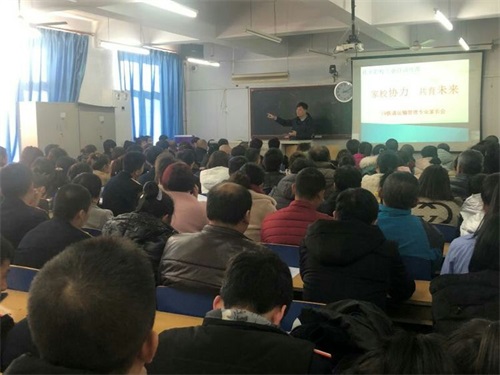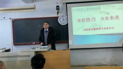 19铁路运输管理专业两个班,与会的家长学生共150人,合作学校“河北铁路轨道中等专业学校”赵锋杰书记对铁路专业发展及学生的培养方向进行了介绍。佟明欢部长在会上对学生在校学习,纪律方面提出了更高的要求。