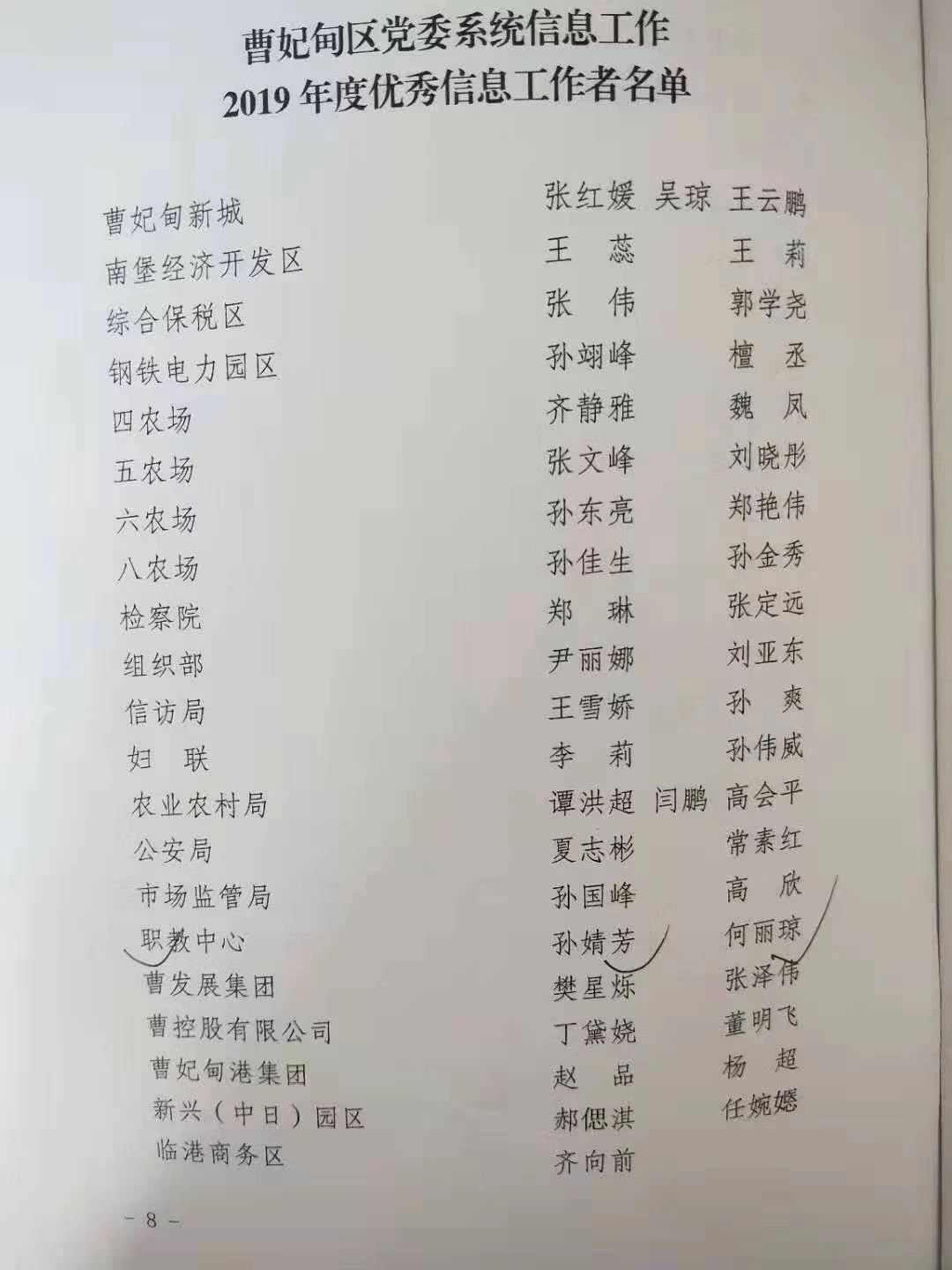 近日,曹妃甸区职教中心被评为2019年度曹妃甸区党委系统信息工作优胜单位。同时,孙婧芳、何丽琼被评为2019年度优秀信息工作者。