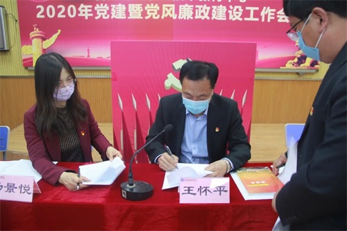 会上,党总支副书记副校长杨景悦同志总结了学校2019年党建主要工作,并对2020年学校党建工作进行了安排部署;总支委员副校长刘辉同志简要传达了区委印发的《区委党的建设(基层组织建设)工作领导小组2020年工作要点》和区委、区政府印发的《关于开展新时代践行习近平总书记“三个努力建成”重要指示十周年系列活动安排》的通知;总支委员副校长李志坚同志传达了区教育体育局党组《关于在全区教育系统开展“纠四风”活动的实施意见》和近期区纠风办对工作纪律检查情况的通报;党总支主要负责人与其他领导班子成员、党总支书记与各支部书记、领导班子成员与各部门分管主任分别签订了2020年全面从严治党主体责任书。