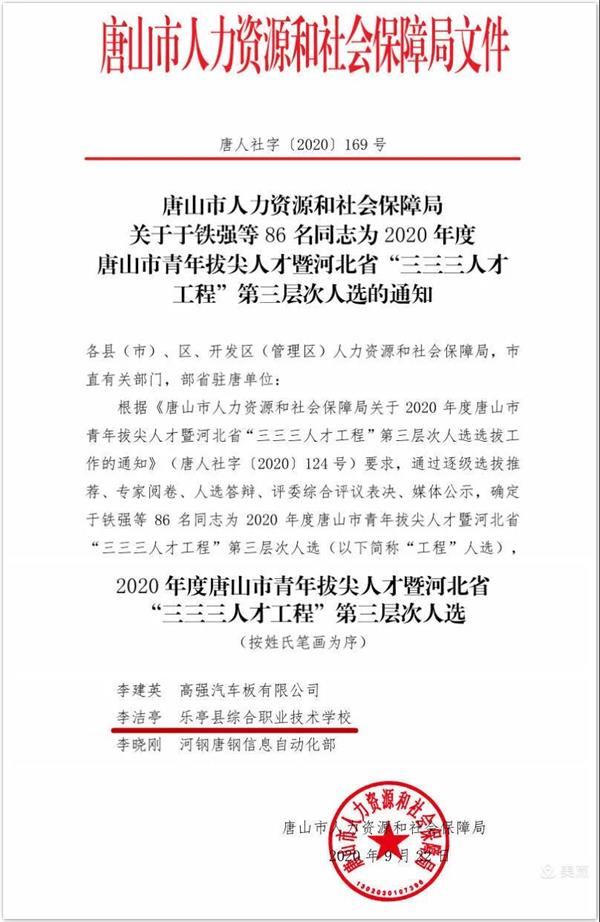 为加快推进我省专业技术人才队伍建设,省人力资源和社会保障厅等七部门联合制定了《河北省“三三三人才工程”实施方案》。河北省“三三三人才工程”是我省培养和管理省级中青年学术技术带头人,实施人才强省战略的重要举措,人选面向我省国有企事业单位、非公有制组织以及中直驻冀单位中青年专业技术人员选拔。选拔和培养具有发展潜能的优秀青年人才作为学术、技术带头人后备人选,形成体系完整、层次分明、动态优化的高层次人才选拔培养体系,为我省各项事业发展提供坚实人才保障。我校李洁亭老师通过逐级选拔推荐、专家阅卷、人选答辩、评委综合评议表决、媒体公示,层层筛选,脱颖而出,成为2020年度唐山市青年拔尖人才暨河北省“三三三人才工程”第三层次人选。