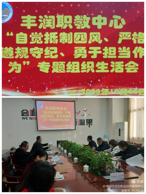 丰润区综合职教中心为了深入学习贯彻党的十九大、十九届二中、三中、四中全会精神和省委九届十次全会、市委十届十次全会、区委四届六次全会精神,全面落实习近平总书记关于作风建设重要指示批示精神,持续整治“四风”,巩固区委第二巡察组对我校巡察反馈问题整改成果,在全校大力弘扬担当作为之风、求真务实之风。为进一步营造风清气正、干事创业的浓厚氛围,于10月22日在行政楼407会议室组织召开了“自觉抵制四风、严格遵规守纪、勇于担当作为”专题组织生活会,学校全体中层及以上领导干部参加了会议,会议由副校长张雪东同志主持。