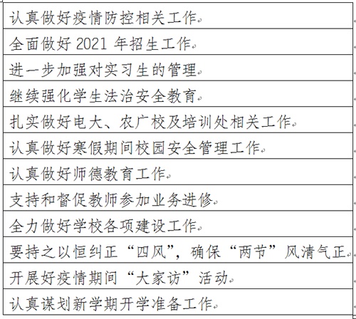 会上,副校长刘辉对2020年学校工作做了全面总结,副校长李志坚对学校假期工作特别是疫情防控工作进行了全面安排部署,副校长杨景悦就2021年学校重点工作进行了通报,并对工作纪律、工作作风等问题进行了强调,会议最后,校长王怀平作重要讲话。