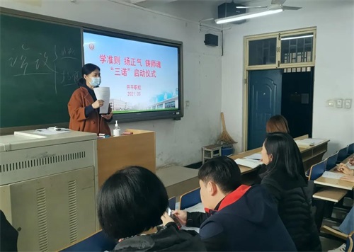 为全面贯彻落实开平区教育局关于开展“三诺”活动的实施方案,全面从严治党、纠正“四风”和作风纪律,大力弘扬高尚师德师风,2021年3月19日,开平职校召开学准则、扬正气、铸师魂,“三诺”启动仪式。
