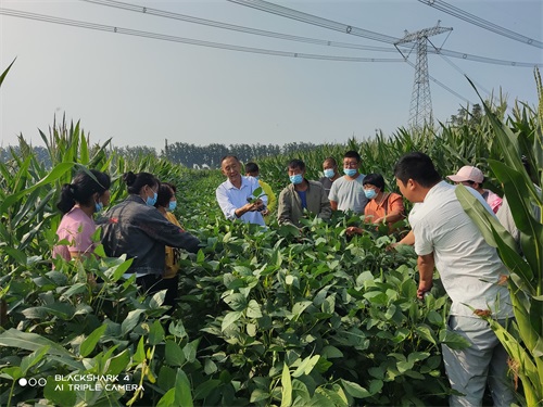 大家观摩了郝利民的大豆玉米带状复合种植基地,参观过程中,郝经理介绍了复合种植的基本情况,包括规模、大豆和玉米的种植操作要点、目前的长势情况等;马志老师就该基地种植状况进行了评估,从种植模式、大豆玉米行比、大豆株密等方面分析了优势与不足,指出目前存在的最大问题是豆缘蝽危害明显,并进行了防治措施指导;景艳杰老师针对作物生长态势强调了复合种植前期的大豆、玉米选种技术要点。学员们均认真聆听,效果较好。