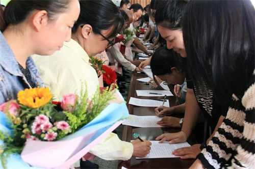 青年教师为指导教师献花,双方签定“青蓝工程”师徒结对协议书。