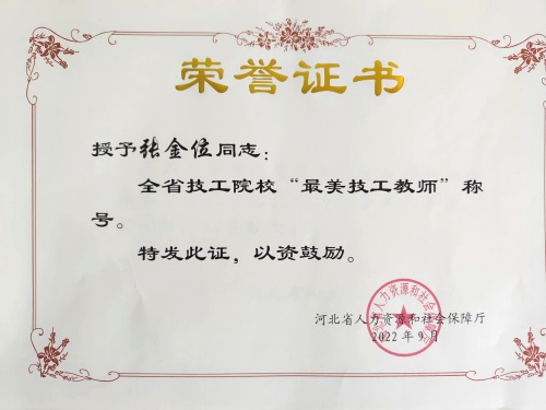 近日,玉田职教中心教师张金位被河北省人力资源和社会保障厅评为“最美技工教师”,全省共30人入选。