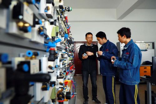 ↑5月9日,滦南县职业教育中心老师正在给学生介绍液压实验元件。(刘兰伟 摄)
