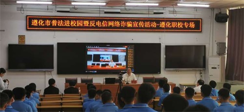学法以明道,用法以立身。为进一步加强反诈防骗宣传力度,不断提高师生防诈骗能力。5月23日遵化市职业教育联合学校邀请我市司法局副局长张国荣、市公安局刑警队反诈骗科警官孙明月、河北华旗律师事务所律师于洁到校进行以“普法进校园暨反电信网络诈骗”为主题的法治教育宣讲。参与本次活动的领导还有市教育局教育科科长范玉波、遵化市职业教育联合学校党总支副书记、常务副校长孟凡正和副校长唐柯。