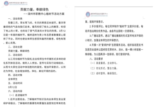 阳春三月,草长莺飞间,冬天的寒意还未褪尽,春天带着绿色的气息向我们走来,春风吹绿了枝头上的嫩芽,吹绿了地上的小草,也吹动了意气风发的学生的热情。在植树节来临之际,滦州市职教中心德育处团委组织广大师生开展了形式多样的绿化系列体验活动。做到人人参加,宣传与实际行动相结合,从而令大家在活动中体验胜利的喜悦,增加环保意识,以到达为学校、社会增加绿色,净化、美化环境的目的。